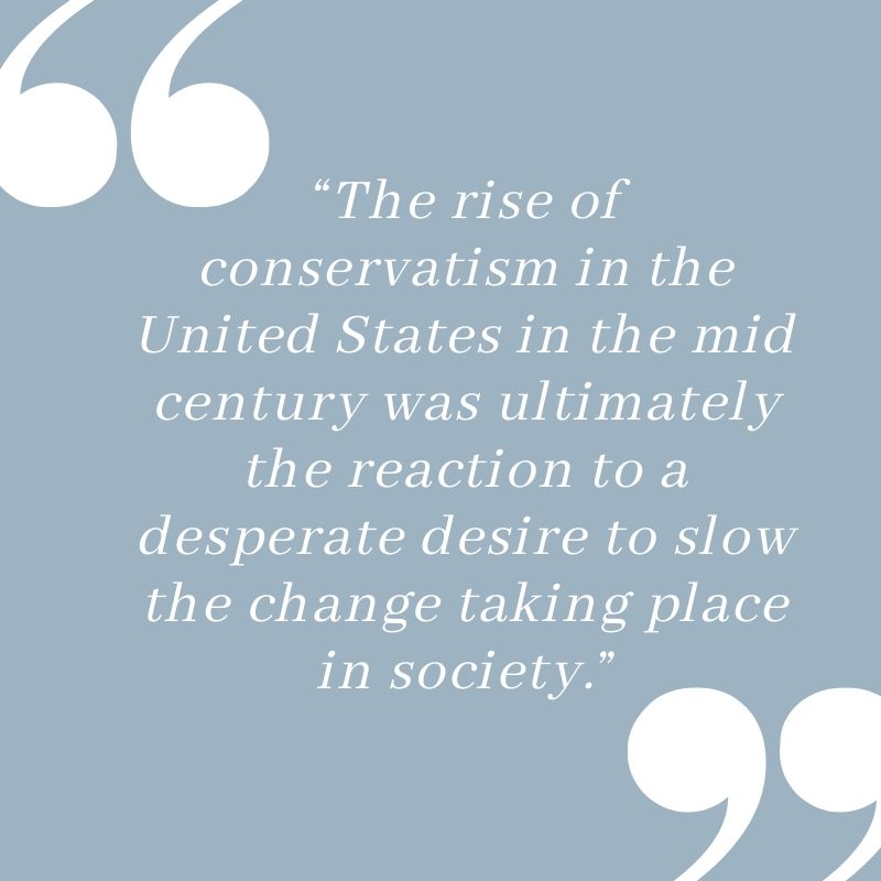 For years, the counterculture had resulted in the dramatically increasing popularity of feminism and the civil rights movement. But for conservatives this translated into the breakdown of “family values.” They saw divorce and women entering the workplace as the devolution of gender structures and, therefore, the devolution of families. The freedom of blacks was the end of their own opportunities and a disruption of their way of life. The rise of conservatism in the United States in the mid century was ultimately the reaction to a desperate desire to slow the change taking place in society.