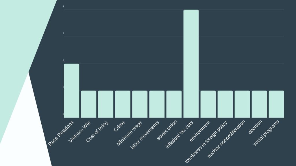 This is how frequently each specific topic was discussed between my 6 articles. Besides inflation/ tax cuts, no individual topic was brought up to bring any conclusive results about what was most important. That being said, this probably gives a wide view of the issues of importance in the election of 1980.