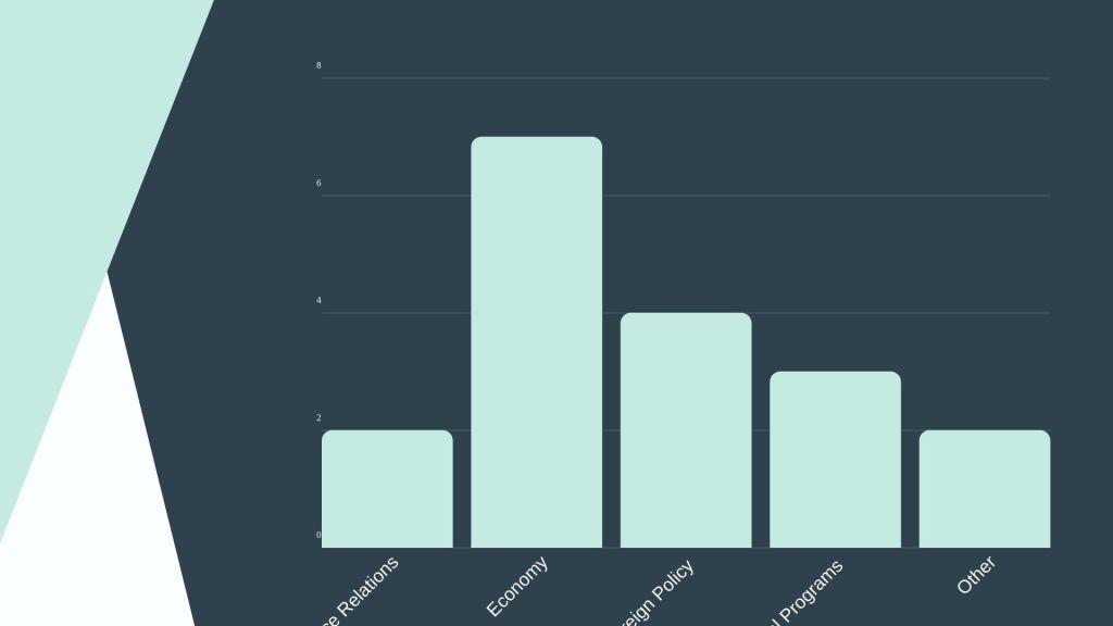 This graph categorizes the more specific topics listed above. In order they are: race relations, the economy, foreign policy, social programs, and other. This gives a broader view of the types of issues that were important and provides a more empirical sense of what would have been the prevalent topics. The Economy and Foreign Policy have the most mentions among articles.